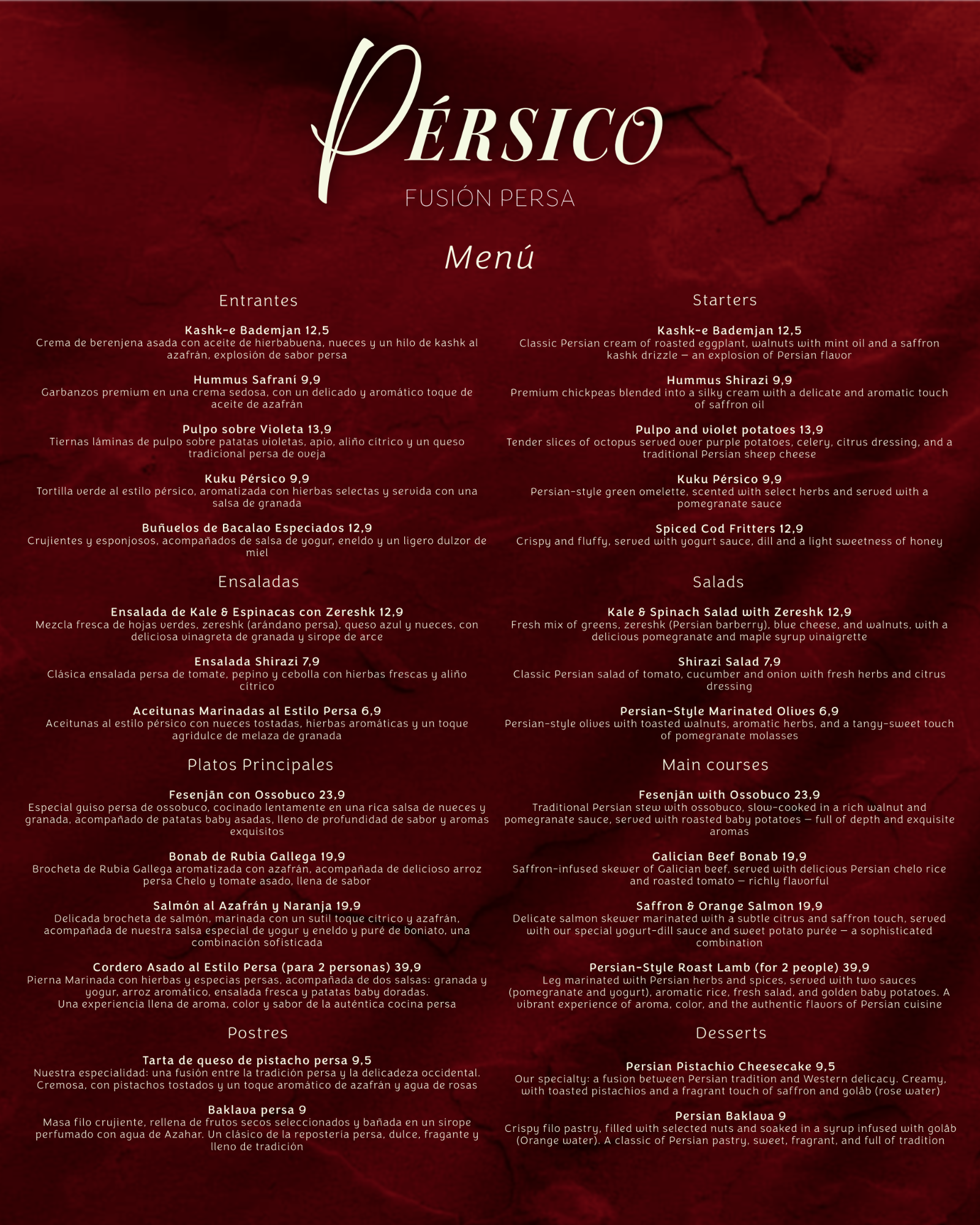 Pérsico ofrece la fusión perfecta entre tradición persa y creatividad contemporánea, en un espacio minimalista diseñado para deleitar tus sentidos.